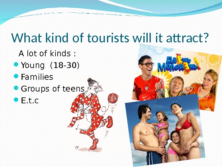 What kind of tourists will it attract? A lot of kinds : Young (18 -30) Families Groups of teens E. t. c