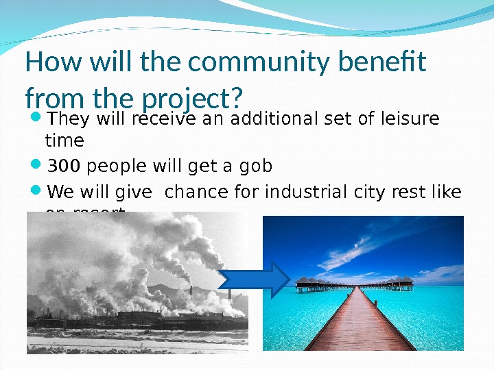 How will the community benefit from the project? They will receivean additional setofleisure time 300 people will get a gob We will give chance for industrial city rest like on resort