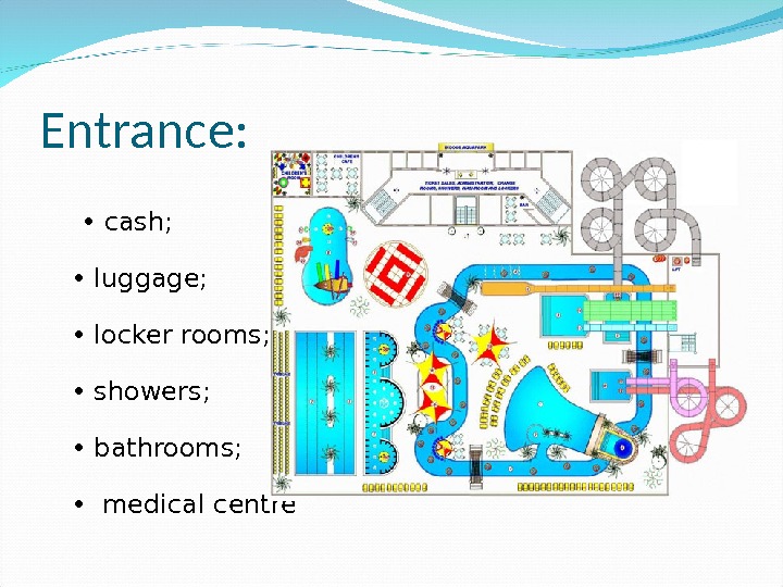 Entrance: • cash; • luggage; • locker rooms; • showers; • bathrooms; • medical centre