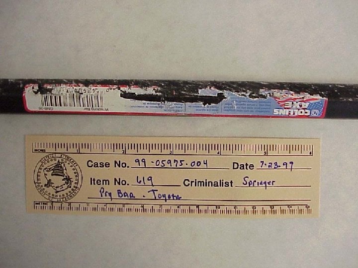 INTIAL EXAMINATIONS BLACK PRY BAR • Green Paint on bar consistent with green painted trim on front door – Butano Dr. • Glass on bar similar to broken glass at the Medical Office • Paint transfer on broken glass in door at the Medical Office similar to black pry bar