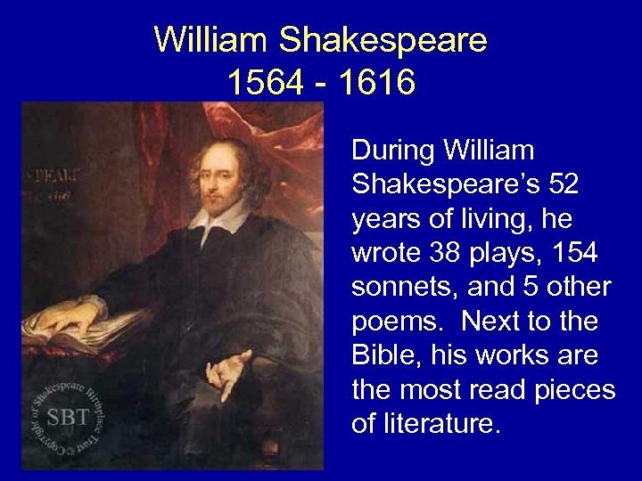 William Shakespeare 1564 - 1616 During William Shakespeare’s 52 years of living, he wrote 38 plays, 154 sonnets, and 5 other poems. Next to the Bible, his works are the most read pieces of literature.