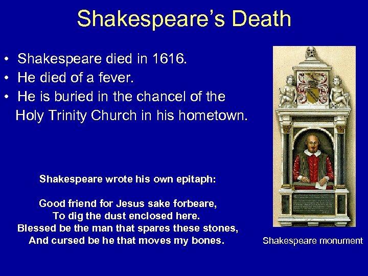Shakespeare’s Death • Shakespeare died in 1616. • He died of a fever. • He is buried in the chancel of the Holy Trinity Church in his hometown. Shakespeare wrote his own epitaph: Good friend for Jesus sake forbeare, To dig the dust enclosed here. Blessed be the man that spares these stones, And cursed be he that moves my bones. Shakespeare monument