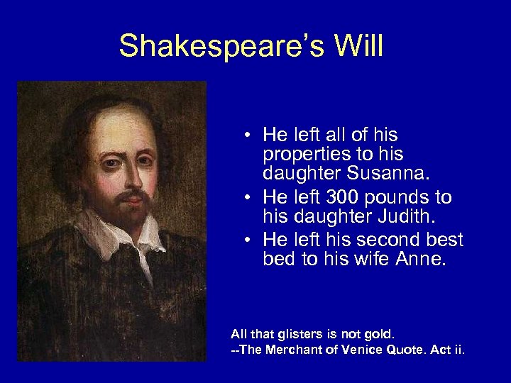 Shakespeare’s Will • He left all of his properties to his daughter Susanna. • He left 300 pounds to his daughter Judith. • He left his second best bed to his wife Anne. All that glisters is not gold. --The Merchant of Venice Quote. Act ii.