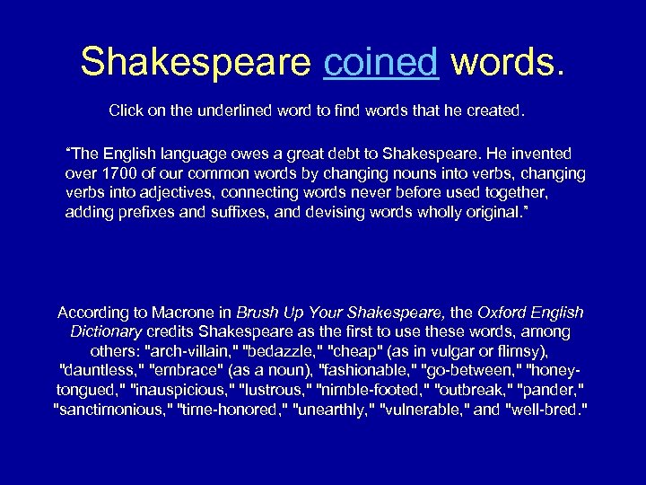 Shakespeare coined words. Click on the underlined word to find words that he created. “The English language owes a great debt to Shakespeare. He invented over 1700 of our common words by changing nouns into verbs, changing verbs into adjectives, connecting words never before used together, adding prefixes and suffixes, and devising words wholly original. ” According to Macrone in Brush Up Your Shakespeare, the Oxford English Dictionary credits Shakespeare as the first to use these words, among others: "arch-villain, " "bedazzle, " "cheap" (as in vulgar or flimsy), "dauntless, " "embrace" (as a noun), "fashionable, " "go-between, " "honeytongued, " "inauspicious, " "lustrous, " "nimble-footed, " "outbreak, " "pander, " "sanctimonious, " "time-honored, " "unearthly, " "vulnerable, " and "well-bred. "