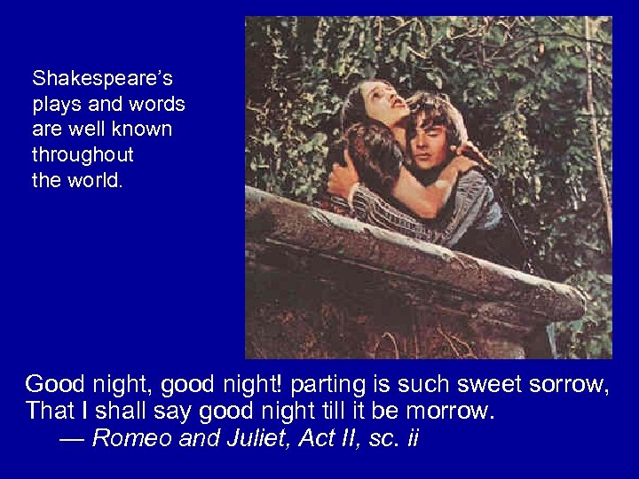 Shakespeare’s plays and words are well known throughout the world. Good night, good night! parting is such sweet sorrow, That I shall say good night till it be morrow. — Romeo and Juliet, Act II, sc. ii