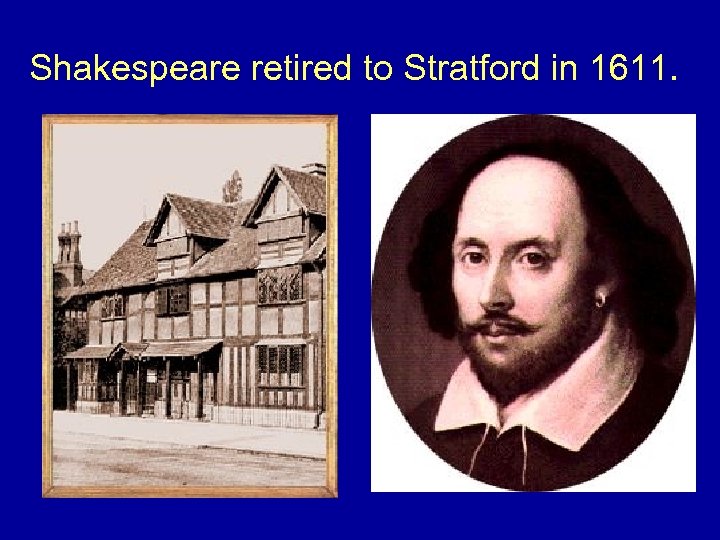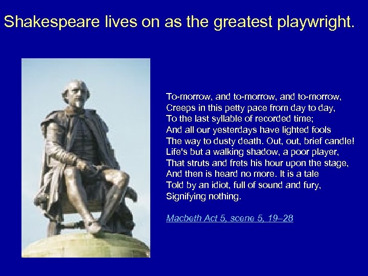 Shakespeare lives on as the greatest playwright. To-morrow, and to-morrow, Creeps in this petty pace from day to day, To the last syllable of recorded time; And all our yesterdays have lighted fools The way to dusty death. Out, out, brief candle! Life's but a walking shadow, a poor player, That struts and frets his hour upon the stage, And then is heard no more. It is a tale Told by an idiot, full of sound and fury, Signifying nothing. Macbeth Act 5, scene 5, 19– 28