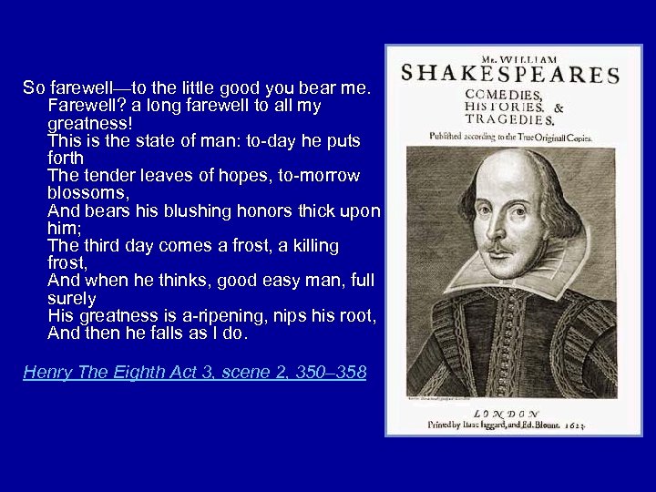 So farewell—to the little good you bear me. Farewell? a long farewell to all my greatness! This is the state of man: to-day he puts forth The tender leaves of hopes, to-morrow blossoms, And bears his blushing honors thick upon him; The third day comes a frost, a killing frost, And when he thinks, good easy man, full surely His greatness is a-ripening, nips his root, And then he falls as I do. Henry The Eighth Act 3, scene 2, 350– 358