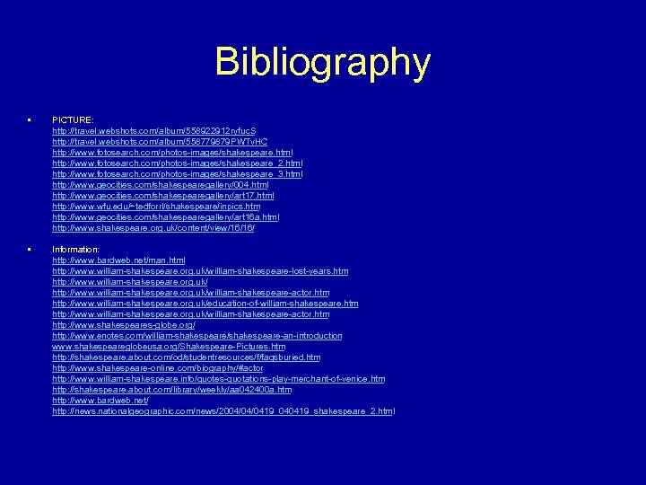 Bibliography • • PICTURE: http: //travel. webshots. com/album/558922912 ryfuc. S http: //travel. webshots. com/album/558779879 PWTv. HC http: //www. fotosearch. com/photos-images/shakespeare. html http: //www. fotosearch. com/photos-images/shakespeare_2. html http: //www. fotosearch. com/photos-images/shakespeare_3. html http: //www. geocities. com/shakespearegallery/004. html http: //www. geocities. com/shakespearegallery/art 17. html http: //www. wfu. edu/~tedforrl/shakespeare/inpics. htm http: //www. geocities. com/shakespearegallery/art 16 a. html http: //www. shakespeare. org. uk/content/view/16/16/ Information: http: //www. bardweb. net/man. html http: //www. william-shakespeare. org. uk/william-shakespeare-lost-years. htm http: //www. william-shakespeare. org. uk/william-shakespeare-actor. htm http: //www. william-shakespeare. org. uk/education-of-william-shakespeare. htm http: //www. william-shakespeare. org. uk/william-shakespeare-actor. htm http: //www. shakespeares-globe. org/ http: //www. enotes. com/william-shakespeare/shakespeare-an-introduction www. shakespeareglobeusa. org/Shakespeare-Pictures. htm http: //shakespeare. about. com/od/studentresources/f/faqsburied. htm http: //www. shakespeare-online. com/biography/#actor http: //www. william-shakespeare. info/quotes-quotations-play-merchant-of-venice. htm http: //shakespeare. about. com/library/weekly/aa 042400 a. htm http: //www. bardweb. net/ http: //news. nationalgeographic. com/news/2004/04/0419_040419_shakespeare_2. html