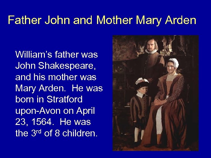 Father John and Mother Mary Arden William’s father was John Shakespeare, and his mother was Mary Arden. He was born in Stratford upon-Avon on April 23, 1564. He was the 3 rd of 8 children.