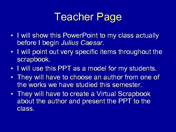 Teacher Page • I will show this Power. Point to my class actually before I begin Julius Caesar. • I will point out very specific items throughout the scrapbook. • I will use this PPT as a model for my students. • They will have to choose an author from one of the works we have studied this semester. • They will have to create a Virtual Scrapbook about the author and present the PPT to the class.