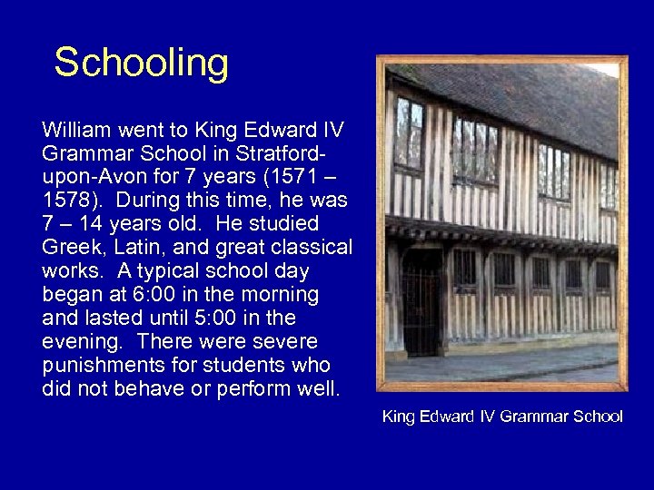 Schooling William went to King Edward IV Grammar School in Stratfordupon-Avon for 7 years (1571 – 1578). During this time, he was 7 – 14 years old. He studied Greek, Latin, and great classical works. A typical school day began at 6: 00 in the morning and lasted until 5: 00 in the evening. There were severe punishments for students who did not behave or perform well. King Edward IV Grammar School