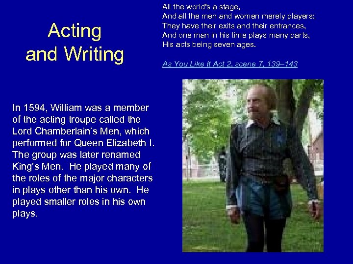 Acting and Writing In 1594, William was a member of the acting troupe called the Lord Chamberlain’s Men, which performed for Queen Elizabeth I. The group was later renamed King’s Men. He played many of the roles of the major characters in plays other than his own. He played smaller roles in his own plays. All the world's a stage, And all the men and women merely players; They have their exits and their entrances, And one man in his time plays many parts, His acts being seven ages. As You Like It Act 2, scene 7, 139– 143