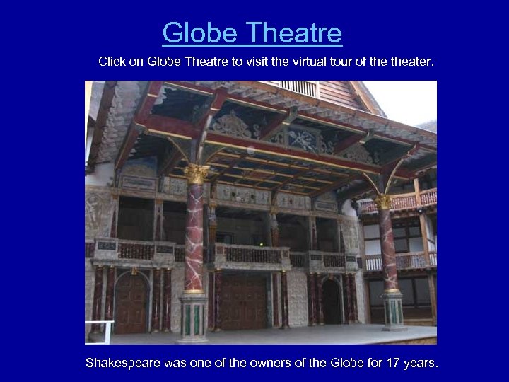 Globe Theatre Click on Globe Theatre to visit the virtual tour of theater. Shakespeare was one of the owners of the Globe for 17 years.