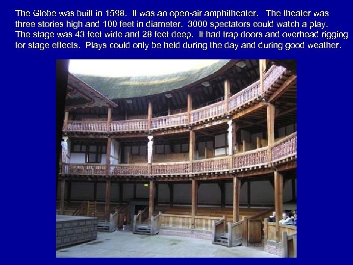 The Globe was built in 1598. It was an open-air amphitheater. The theater was three stories high and 100 feet in diameter. 3000 spectators could watch a play. The stage was 43 feet wide and 28 feet deep. It had trap doors and overhead rigging for stage effects. Plays could only be held during the day and during good weather.