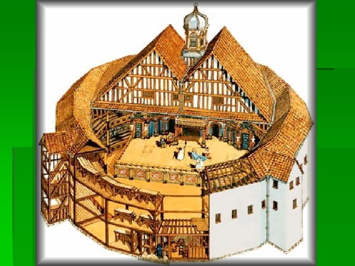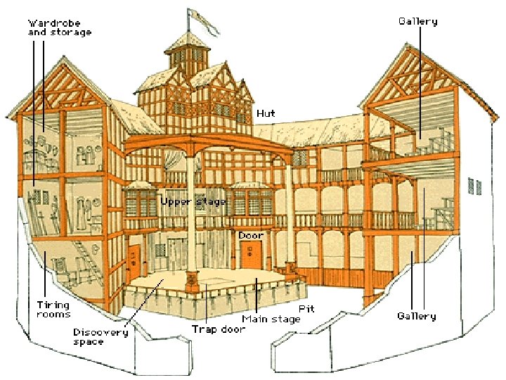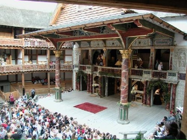 The Globe Theatre Characteristics: § Shape: 8 -sided frame with a central yard open to the sky § No curtain: scenes flowed swiftly from one to the other without interruption