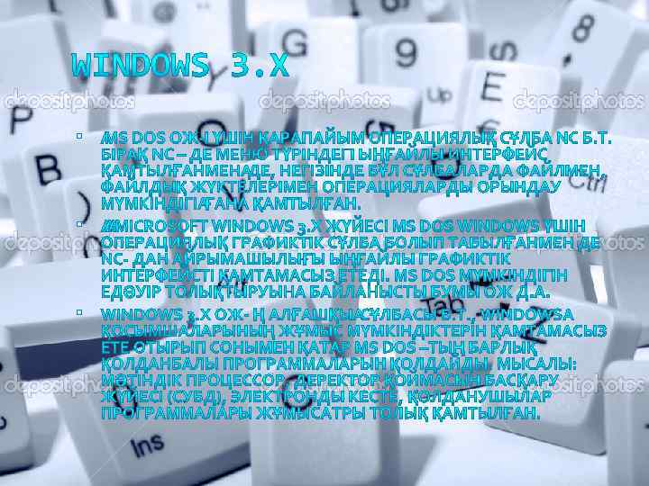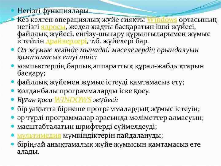 Windows-95 Операциялық жүйесі. Бұл ОЖ- е і 80386 – дан бастап Intel фирмасының 32 разрядты микропроцессорларын көптапсырмалы ОЖ. Бірақ Windows 95 - ті 32 разрядты деп толық анықтама беруге болмайды, себебі оның Windows 3. х. ядроларына сүйеніп құрылған. Мұндағы әр тапсырма уақыт бойынша үлестіріп, приоритетті бойынша орындалып оытрады. Неғұрлым приоритеті жоғары болса, соғұрлым приоритеті жоғары тапсырмаға ерекше маңыз беріліп отырады. Егер приоритеті төмен тапсырмаға процессорлық уақыт қажет болса, оның приоритеті көтерімді. Яғни приоритеті жоғары болған алдындағы тапсырмалар кезектен ығысырылады. Мұндай ығыстырушы көптасырмалының тек қана Windows-95 те жазылған программаларға ғана тән. Windows- те MS DOS пен байланысты, бірақ бұл байланыс жиі болып тұрады. Windows 3. х- те файлға қатынас MS DOS файлдың жүйесін қолдану арқылы жүргізілетін болса, Windows-95 файлға тура қатынас құрады. Windows-иерархиялық файлдың жүйесі какталог орнына папка деген түсінікті енгізуді файл аттары (254 символға) дейінгі ұзындықты қамтиды. Windows-95 ОЖ- елокальды торап құруға болады, бұл торапта ол клиенттердің де, серверлердің де функциясын атқара алады. Windows-95 графиктік интерфейсі ОЖ- де тіркелген және жұмыс үстелі деген түсінікті қамтиды жұмыс үстелі экран бетін толық бірнеше элементтерден тұрады.