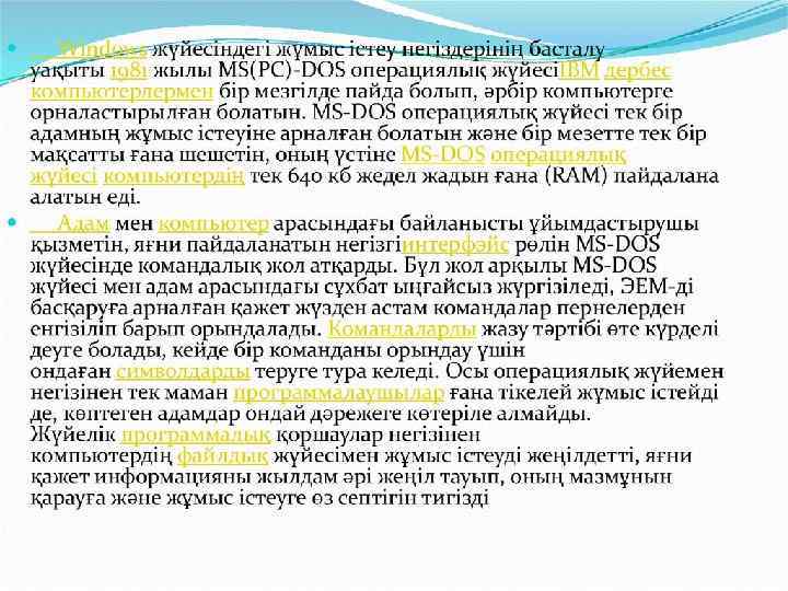 Windows жүйесіндегі жұмыс істеу 1981 негіздерінің басталу уақыты 1981 жылы IBM MS(PC)-DOS операциялық жүйесі IBMдербес компьютерлермен бір мезгілде пайда болып, әрбір компьютерге орналастырылған болатын. MS-DOS операциялық жүйесі тек бір адамның жұмыс істеуіне арналған болатын және бір мезетте тек бір мақсатты ғана MS-DOS операциялы шешетін, оның үстіне MS-DOS операциялық жүйесікомпьютердің тек 640 кб жедел жадын ғана (RAM) пайдалана алатын еді