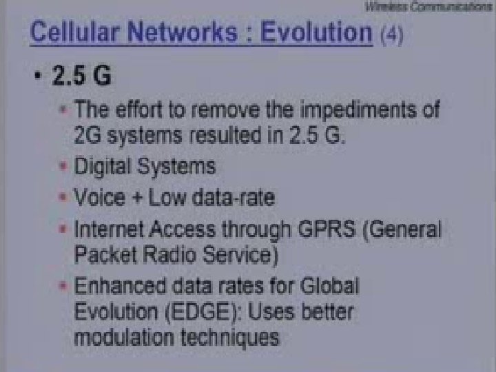 EDGE (2. 75 G) l l l l More advanced upgrade to 2 G that requires addition of new hardware and software Developed as a path to become eventual 3 G high speed data access New modulation 8 -PSK in addition to GSM standard GMSK. Allows nine different formats known as Multiple modulation and Coding Scheme (MCS) Each MCS state may either use GMSK (low rate) or 8 -PSK (high rate). A family of MCS for each GSM slot and users can adaptively determine best MCS setting User start first with max error protection and max data rate until the link has unacceptable outage or delay By combining different channels (multi-carrier trans), EDGE
