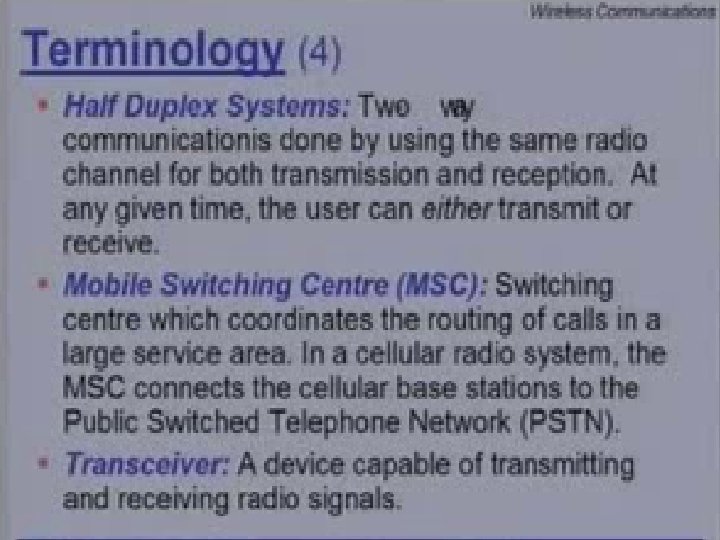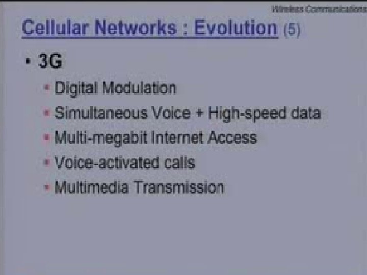 Evolution of Wireless Systems l l The worldwide success of cellular telephone has lead to the development of newer wireless systems and standards for other types of communications besides mobile voice. For example – Cellular networks to facilitate high speed data traffic – Replace fiber optics and copper lines between fixed points several kms apart. – Replacement of wires within homes, offices etc (evolution of Bluetooth)