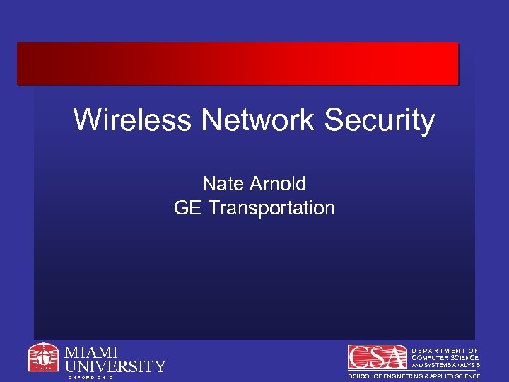 Wireless Network Security Nate Arnold GE Transportation MIAMI UNIVERSITY O X F O R D O H I O DEPARTMENT OF COMPUTER SCIENCE AND SYSTEMS ANALYSIS SCHOOL OF ENGINEERING & APPLIED SCIENCE