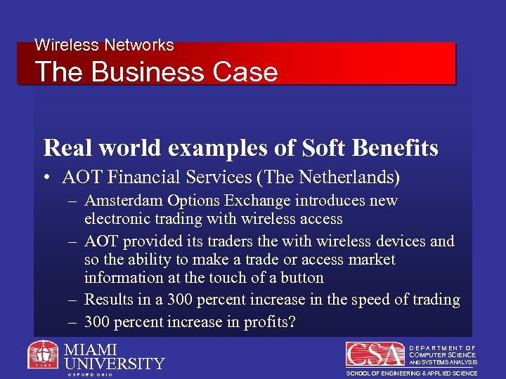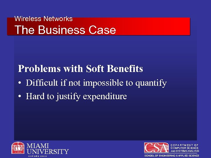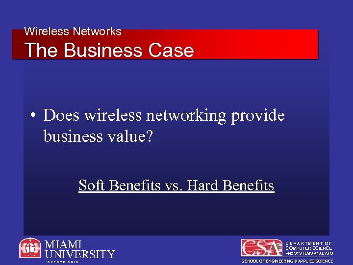 Wireless Networks The Business Case Hard Benefits • Dollar amount of cost savings • Measurable increases in productivity MIAMI UNIVERSITY O X F O R D O H I O DEPARTMENT OF COMPUTER SCIENCE AND SYSTEMS ANALYSIS SCHOOL OF ENGINEERING & APPLIED SCIENCE