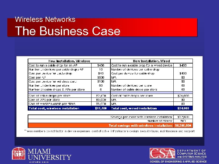 Wireless Networks The Business Case Hard Benefits – Cost savings • Case study of a major national retail chain with more than 500 stores • Focuses on total cost of ownership of wireless vs. wired networks in stores • Initial installation, and store reconfigurations both considered MIAMI UNIVERSITY O X F O R D O H I O DEPARTMENT OF COMPUTER SCIENCE AND SYSTEMS ANALYSIS SCHOOL OF ENGINEERING & APPLIED SCIENCE