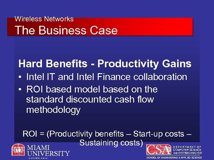 Wireless Networks The Business Case Hard Benefits - Productivity Gains • Intel IT and Intel Finance collaboration • ROI based model based on the standard discounted cash flow methodology ROI = (Productivity benefits – Start-up costs – Sustaining costs) MIAMI UNIVERSITY O X F O R D O H I O DEPARTMENT OF COMPUTER SCIENCE AND SYSTEMS ANALYSIS SCHOOL OF ENGINEERING & APPLIED SCIENCE