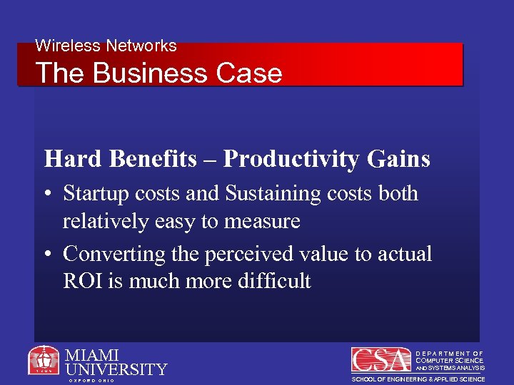 Wireless Networks The Business Case Hard Benefits – Productivity Gains • Startup costs and Sustaining costs both relatively easy to measure • Converting the perceived value to actual ROI is much more difficult MIAMI UNIVERSITY O X F O R D O H I O DEPARTMENT OF COMPUTER SCIENCE AND SYSTEMS ANALYSIS SCHOOL OF ENGINEERING & APPLIED SCIENCE