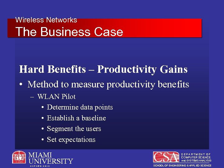 Wireless Networks The Business Case Hard Benefits – Productivity Gains • Method to measure productivity benefits – WLAN Pilot • Determine data points • Establish a baseline • Segment the users • Set expectations MIAMI UNIVERSITY O X F O R D O H I O DEPARTMENT OF COMPUTER SCIENCE AND SYSTEMS ANALYSIS SCHOOL OF ENGINEERING & APPLIED SCIENCE