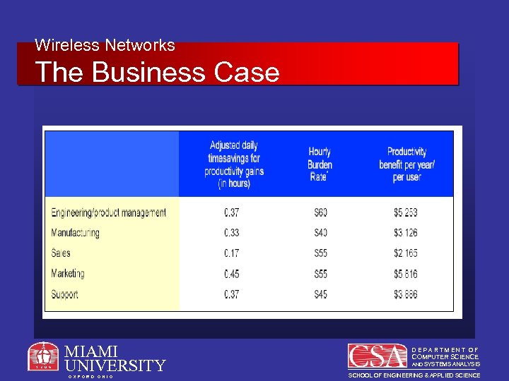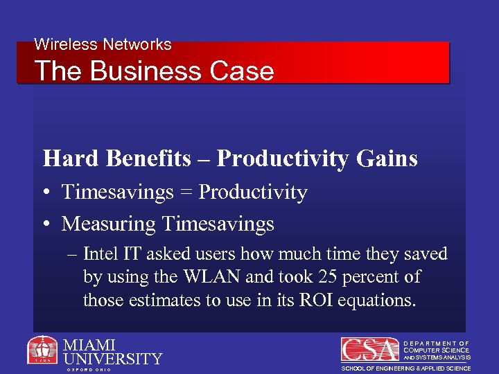Wireless Networks The Business Case Hard Benefits – Productivity Gains • Timesavings = Productivity • Measuring Timesavings – Intel IT asked users how much time they saved by using the WLAN and took 25 percent of those estimates to use in its ROI equations. MIAMI UNIVERSITY O X F O R D O H I O DEPARTMENT OF COMPUTER SCIENCE AND SYSTEMS ANALYSIS SCHOOL OF ENGINEERING & APPLIED SCIENCE