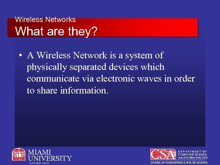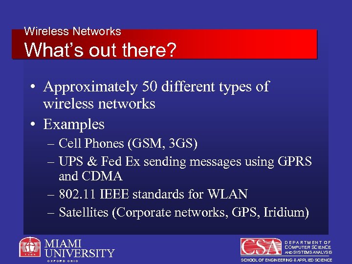 Wireless Networks What’s out there? • Approximately 50 different types of wireless networks • Examples – Cell Phones (GSM, 3 GS) – UPS & Fed Ex sending messages using GPRS and CDMA – 802. 11 IEEE standards for WLAN – Satellites (Corporate networks, GPS, Iridium) MIAMI UNIVERSITY O X F O R D O H I O DEPARTMENT OF COMPUTER SCIENCE AND SYSTEMS ANALYSIS SCHOOL OF ENGINEERING & APPLIED SCIENCE