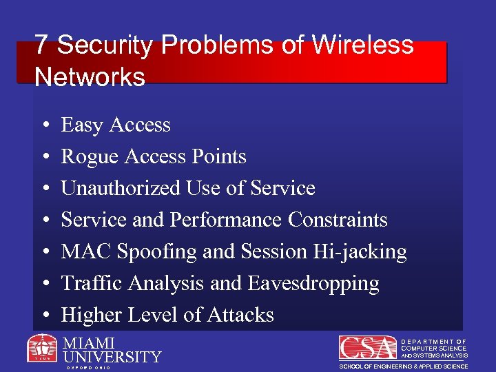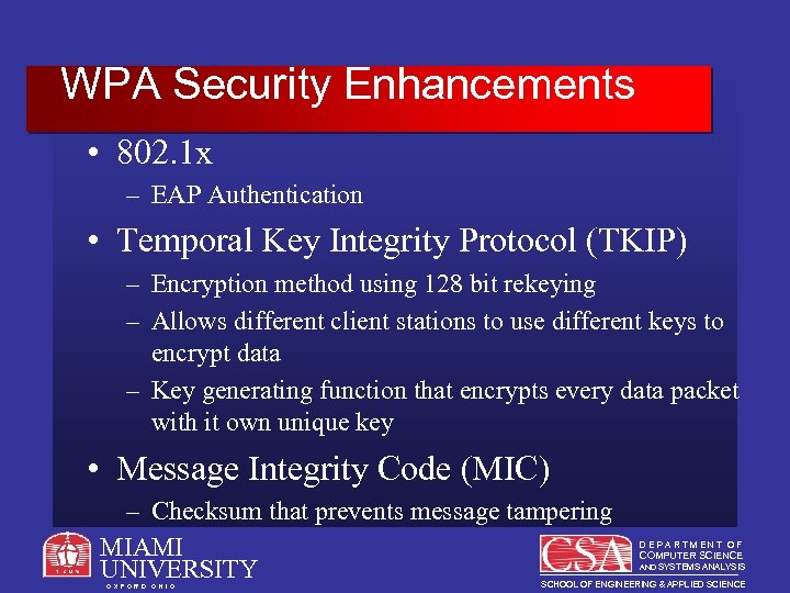 WPA Security Enhancements • 802. 1 x – EAP Authentication • Temporal Key Integrity Protocol (TKIP) – Encryption method using 128 bit rekeying – Allows different client stations to use different keys to encrypt data – Key generating function that encrypts every data packet with it own unique key • Message Integrity Code (MIC) – Checksum that prevents message tampering MIAMI UNIVERSITY O X F O R D O H I O DEPARTMENT OF COMPUTER SCIENCE AND SYSTEMS ANALYSIS SCHOOL OF ENGINEERING & APPLIED SCIENCE