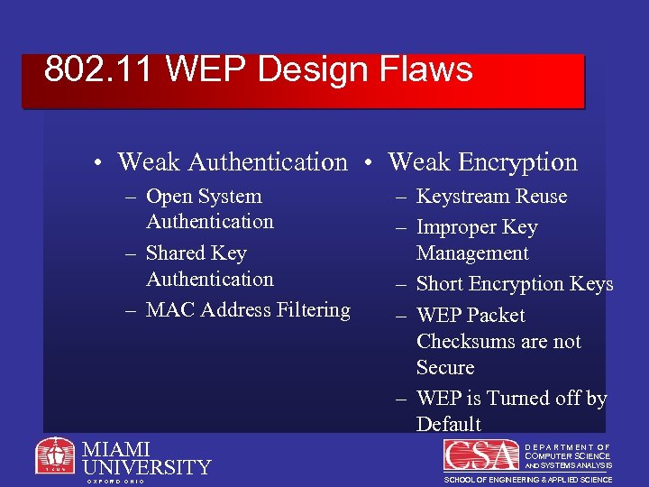 802. 11 WEP Design Flaws • Weak Authentication • Weak Encryption – Open System Authentication – Shared Key Authentication – MAC Address Filtering MIAMI UNIVERSITY O X F O R D O H I O – Keystream Reuse – Improper Key Management – Short Encryption Keys – WEP Packet Checksums are not Secure – WEP is Turned off by Default DEPARTMENT OF COMPUTER SCIENCE AND SYSTEMS ANALYSIS SCHOOL OF ENGINEERING & APPLIED SCIENCE
