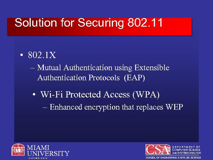 Solution for Securing 802. 11 • 802. 1 X – Mutual Authentication using Extensible Authentication Protocols (EAP) • Wi-Fi Protected Access (WPA) – Enhanced encryption that replaces WEP MIAMI UNIVERSITY O X F O R D O H I O DEPARTMENT OF COMPUTER SCIENCE AND SYSTEMS ANALYSIS SCHOOL OF ENGINEERING & APPLIED SCIENCE