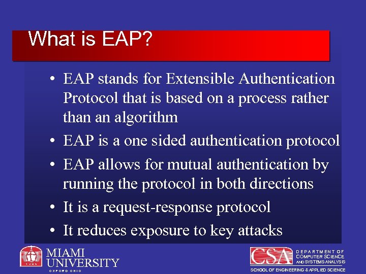 What is EAP? • EAP stands for Extensible Authentication Protocol that is based on a process rather than an algorithm • EAP is a one sided authentication protocol • EAP allows for mutual authentication by running the protocol in both directions • It is a request-response protocol • It reduces exposure to key attacks MIAMI UNIVERSITY O X F O R D O H I O DEPARTMENT OF COMPUTER SCIENCE AND SYSTEMS ANALYSIS SCHOOL OF ENGINEERING & APPLIED SCIENCE