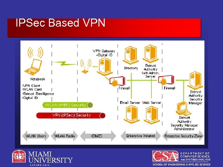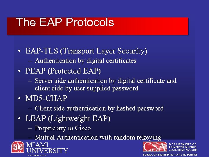 The EAP Protocols • EAP-TLS (Transport Layer Security) – Authentication by digital certificates • PEAP (Protected EAP) – Server side authentication by digital certificate and client side by user supplied password • MD 5 -CHAP – Client side authentication by hashed password • LEAP (Lightweight EAP) – Proprietary to Cisco – Mutual Authentication with random rekeying MIAMI UNIVERSITY O X F O R D O H I O DEPARTMENT OF COMPUTER SCIENCE AND SYSTEMS ANALYSIS SCHOOL OF ENGINEERING & APPLIED SCIENCE