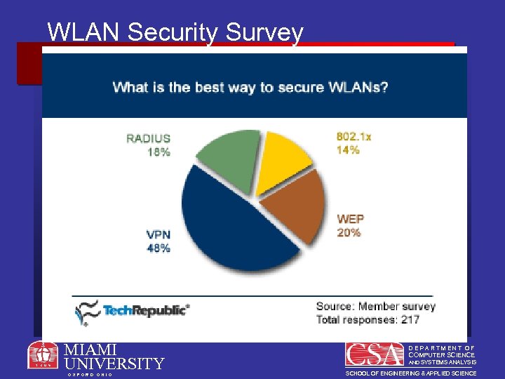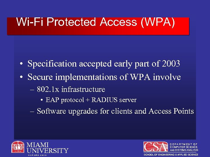 Wi-Fi Protected Access (WPA) • Specification accepted early part of 2003 • Secure implementations of WPA involve – 802. 1 x infrastructure • EAP protocol + RADIUS server – Software upgrades for clients and Access Points MIAMI UNIVERSITY O X F O R D O H I O DEPARTMENT OF COMPUTER SCIENCE AND SYSTEMS ANALYSIS SCHOOL OF ENGINEERING & APPLIED SCIENCE