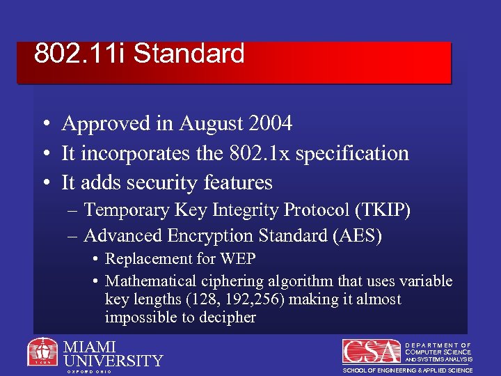 802. 11 i Standard • Approved in August 2004 • It incorporates the 802. 1 x specification • It adds security features – Temporary Key Integrity Protocol (TKIP) – Advanced Encryption Standard (AES) • Replacement for WEP • Mathematical ciphering algorithm that uses variable key lengths (128, 192, 256) making it almost impossible to decipher MIAMI UNIVERSITY O X F O R D O H I O DEPARTMENT OF COMPUTER SCIENCE AND SYSTEMS ANALYSIS SCHOOL OF ENGINEERING & APPLIED SCIENCE