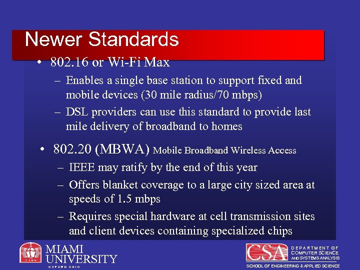 Newer Standards • 802. 16 or Wi-Fi Max – Enables a single base station to support fixed and mobile devices (30 mile radius/70 mbps) – DSL providers can use this standard to provide last mile delivery of broadband to homes • 802. 20 (MBWA) Mobile Broadband Wireless Access – IEEE may ratify by the end of this year – Offers blanket coverage to a large city sized area at speeds of 1. 5 mbps – Requires special hardware at cell transmission sites and client devices containing specialized chips MIAMI UNIVERSITY O X F O R D O H I O DEPARTMENT OF COMPUTER SCIENCE AND SYSTEMS ANALYSIS SCHOOL OF ENGINEERING & APPLIED SCIENCE