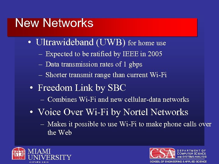 New Networks • Ultrawideband (UWB) for home use – Expected to be ratified by IEEE in 2005 – Data transmission rates of 1 gbps – Shorter transmit range than current Wi-Fi • Freedom Link by SBC – Combines Wi-Fi and new cellular-data networks • Voice Over Wi-Fi by Nortel Networks – Makes it possible to use Wi-Fi to make phone calls over the Web MIAMI UNIVERSITY O X F O R D O H I O DEPARTMENT OF COMPUTER SCIENCE AND SYSTEMS ANALYSIS SCHOOL OF ENGINEERING & APPLIED SCIENCE