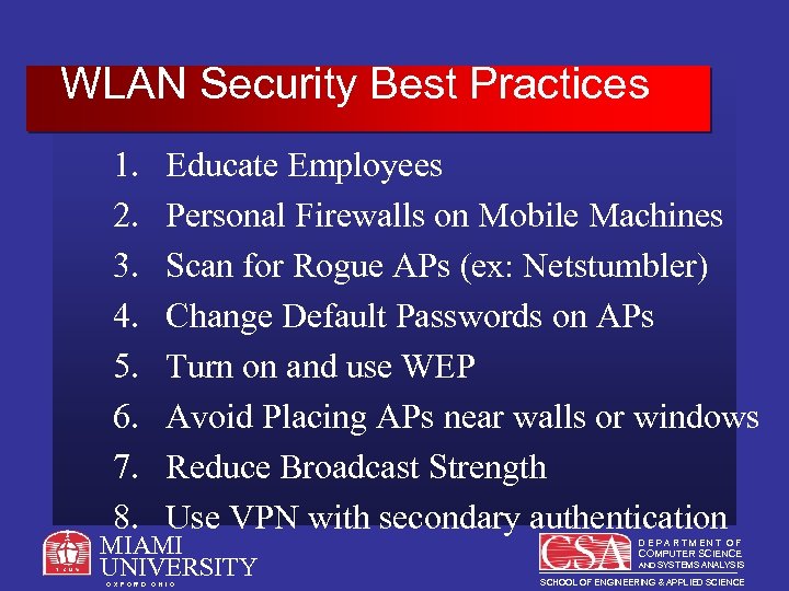 WLAN Security Best Practices 1. 2. 3. 4. 5. 6. 7. 8. Educate Employees Personal Firewalls on Mobile Machines Scan for Rogue APs (ex: Netstumbler) Change Default Passwords on APs Turn on and use WEP Avoid Placing APs near walls or windows Reduce Broadcast Strength Use VPN with secondary authentication MIAMI UNIVERSITY O X F O R D O H I O DEPARTMENT OF COMPUTER SCIENCE AND SYSTEMS ANALYSIS SCHOOL OF ENGINEERING & APPLIED SCIENCE