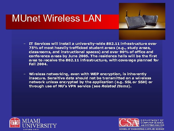 MUnet Wireless LAN – IT Services will install a university-wide 802. 11 infrastructure over 75% of most heavily trafficked student areas (e. g. , study areas, classrooms, and instructional spaces) and over 90% of office and conference areas by June 2005. The residence halls will be the first area to receive the 802. 11 infrastructure, with coverage planned for Fall 2004. – Wireless networking, even with WEP encryption, is inherently insecure. Sensitive data should not be transmitted on a wireless network unless encrypted by the application (e. g. SSL or SSH) or through use of MU's VPN service (see Related Items). MIAMI UNIVERSITY O X F O R D O H I O DEPARTMENT OF COMPUTER SCIENCE AND SYSTEMS ANALYSIS SCHOOL OF ENGINEERING & APPLIED SCIENCE