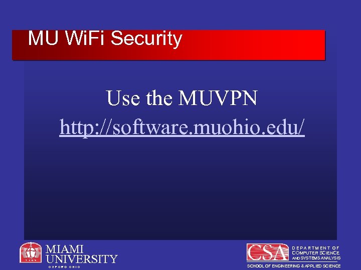MU Wi. Fi Security Use the MUVPN http: //software. muohio. edu/ MIAMI UNIVERSITY O X F O R D O H I O DEPARTMENT OF COMPUTER SCIENCE AND SYSTEMS ANALYSIS SCHOOL OF ENGINEERING & APPLIED SCIENCE