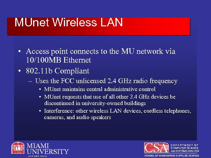 MUnet Wireless LAN • Access point connects to the MU network via 10/100 MB Ethernet • 802. 11 b Compliant – Uses the FCC unlicensed 2. 4 GHz radio frequency • MUnet maintains central administrative control • MUnet requests that use of all other 2. 4 GHz devices be discontinued in university-owned buildings • Interference: other wireless LAN devices, cordless telephones, cameras, and audio speakers MIAMI UNIVERSITY O X F O R D O H I O DEPARTMENT OF COMPUTER SCIENCE AND SYSTEMS ANALYSIS SCHOOL OF ENGINEERING & APPLIED SCIENCE