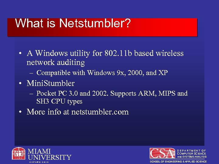 What is Netstumbler? • A Windows utility for 802. 11 b based wireless network auditing – Compatible with Windows 9 x, 2000, and XP • Mini. Stumbler – Pocket PC 3. 0 and 2002. Supports ARM, MIPS and SH 3 CPU types • More info at netstumbler. com MIAMI UNIVERSITY O X F O R D O H I O DEPARTMENT OF COMPUTER SCIENCE AND SYSTEMS ANALYSIS SCHOOL OF ENGINEERING & APPLIED SCIENCE