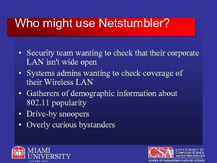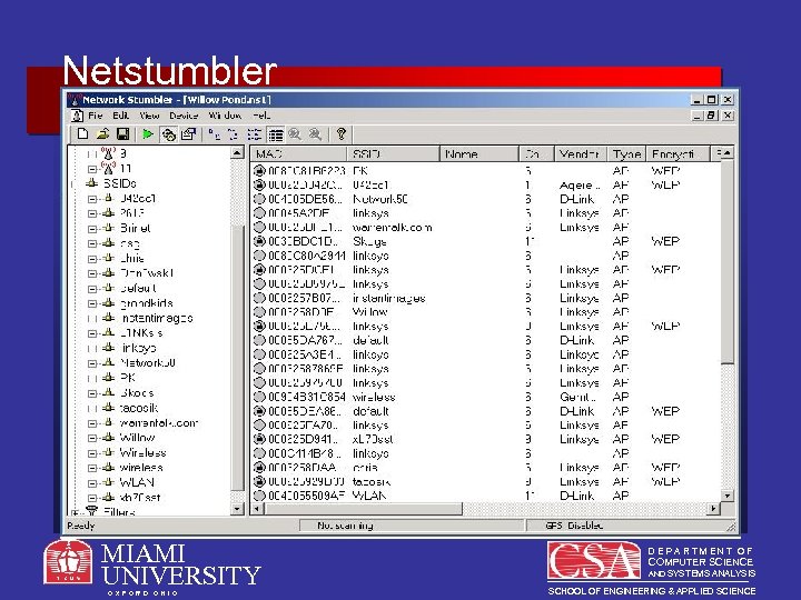 Who might use Netstumbler? • Security team wanting to check that their corporate LAN isn't wide open • Systems admins wanting to check coverage of their Wireless LAN • Gatherers of demographic information about 802. 11 popularity • Drive-by snoopers • Overly curious bystanders MIAMI UNIVERSITY O X F O R D O H I O DEPARTMENT OF COMPUTER SCIENCE AND SYSTEMS ANALYSIS SCHOOL OF ENGINEERING & APPLIED SCIENCE