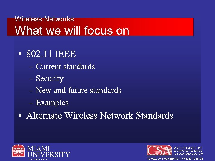 Wireless Networks What we will focus on • 802. 11 IEEE – Current standards – Security – New and future standards – Examples • Alternate Wireless Network Standards MIAMI UNIVERSITY O X F O R D O H I O DEPARTMENT OF COMPUTER SCIENCE AND SYSTEMS ANALYSIS SCHOOL OF ENGINEERING & APPLIED SCIENCE