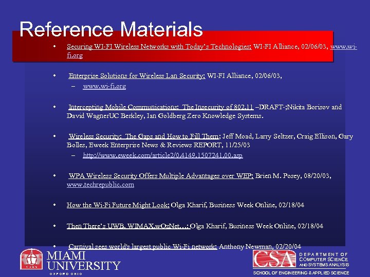 Reference Materials • Securing WI-FI Wireless Networks with Today’s Technologies; WI-FI Alliance, 02/06/03, www. wifi. org • Enterprise Solutions for Wireless Lan Security; WI-FI Alliance, 02/06/03, – www. wi-fi. org • Intercepting Mobile Communications: The Insecurity of 802. 11 –DRAFT-; Nikita Borisov and David Wagner. UC Berkley, Ian Goldberg Zero Knowledge Systems. • Wireless Security: The Gaps and How to Fill Them; Jeff Moad, Larry Seltzer, Craig Ellison, Gary Bolles, Eweek Enterprise News & Reviews REPORT, 11/25/03 – http: //www. eweek. com/article 2/0, 4149, 1507241, 00. asp • WPA Wireless Security Offers Multiple Advantages over WEP; Brien M. Posey, 08/20/03, www. techrepublic. com • How the Wi-Fi Future Might Look; Olga Kharif, Business Week Online, 02/18/04 • Then There’s UWB, WIMAX, w. Oz. Net…; Olga Kharif, Business Week Online, 02/18/04 • Carnival sees world's largest public Wi-Fi network; Anthony Newman, 02/20/04 MIAMI UNIVERSITY O X F O R D O H I O DEPARTMENT OF COMPUTER SCIENCE AND SYSTEMS ANALYSIS SCHOOL OF ENGINEERING & APPLIED SCIENCE