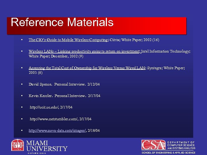 Reference Materials • The CIO’s Guide to Mobile Wireless Computing; Citrix; White Paper; 2002 (16) • Wireless LANs – Linking productivity gains to return on investment; Intel Information Technology; White Paper; December, 2002 (9) • Assessing the Total Cost of Ownership for Wireless Versus Wired LAN; Syntegra; White Paper; 2003 (6) • David Spence. Personal Interview. 2/12/04 • Kevin Kessler. Personal Interview. 2/17/04 • http: //ucit. uc. edu/, 2/17/04 • http: //www. netstumbler. com/, 2/17/04 • http: //www. nova-data. com/images/, 2/18/04 MIAMI UNIVERSITY O X F O R D O H I O DEPARTMENT OF COMPUTER SCIENCE AND SYSTEMS ANALYSIS SCHOOL OF ENGINEERING & APPLIED SCIENCE