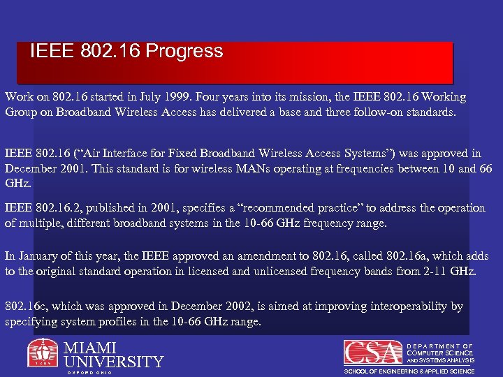 IEEE 802. 16 Progress Work on 802. 16 started in July 1999. Four years into its mission, the IEEE 802. 16 Working Group on Broadband Wireless Access has delivered a base and three follow-on standards. IEEE 802. 16 (“Air Interface for Fixed Broadband Wireless Access Systems”) was approved in December 2001. This standard is for wireless MANs operating at frequencies between 10 and 66 GHz. IEEE 802. 16. 2, published in 2001, specifies a “recommended practice” to address the operation of multiple, different broadband systems in the 10 -66 GHz frequency range. In January of this year, the IEEE approved an amendment to 802. 16, called 802. 16 a, which adds to the original standard operation in licensed and unlicensed frequency bands from 2 -11 GHz. 802. 16 c, which was approved in December 2002, is aimed at improving interoperability by specifying system profiles in the 10 -66 GHz range. MIAMI UNIVERSITY O X F O R D O H I O DEPARTMENT OF COMPUTER SCIENCE AND SYSTEMS ANALYSIS SCHOOL OF ENGINEERING & APPLIED SCIENCE